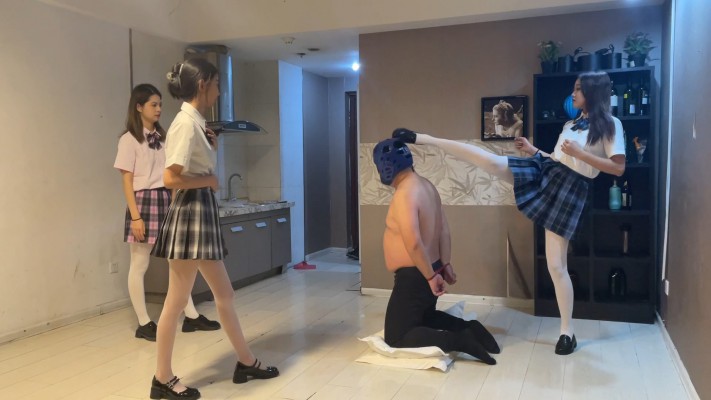 分辨率:1920*1080 超清 横屏 内容:三名身穿JK制服的女孩,以校园霸凌的方式欺辱一个蠢笨胖男生,强制其站立和跪下,三双硬质皮鞋的脚交替轮番的轰在头部上,即使带着防护头套,那击打的冲击力也是让男生几乎脑震荡般的击打感,几乎20分钟连续持续的头部暴踢,之后又进行了强制踢裆和腿绞虐乳,最后三位美女合力将男生踢昏死过去,踩着他自拍为乐,场面真的是暴力与美丽的交织。